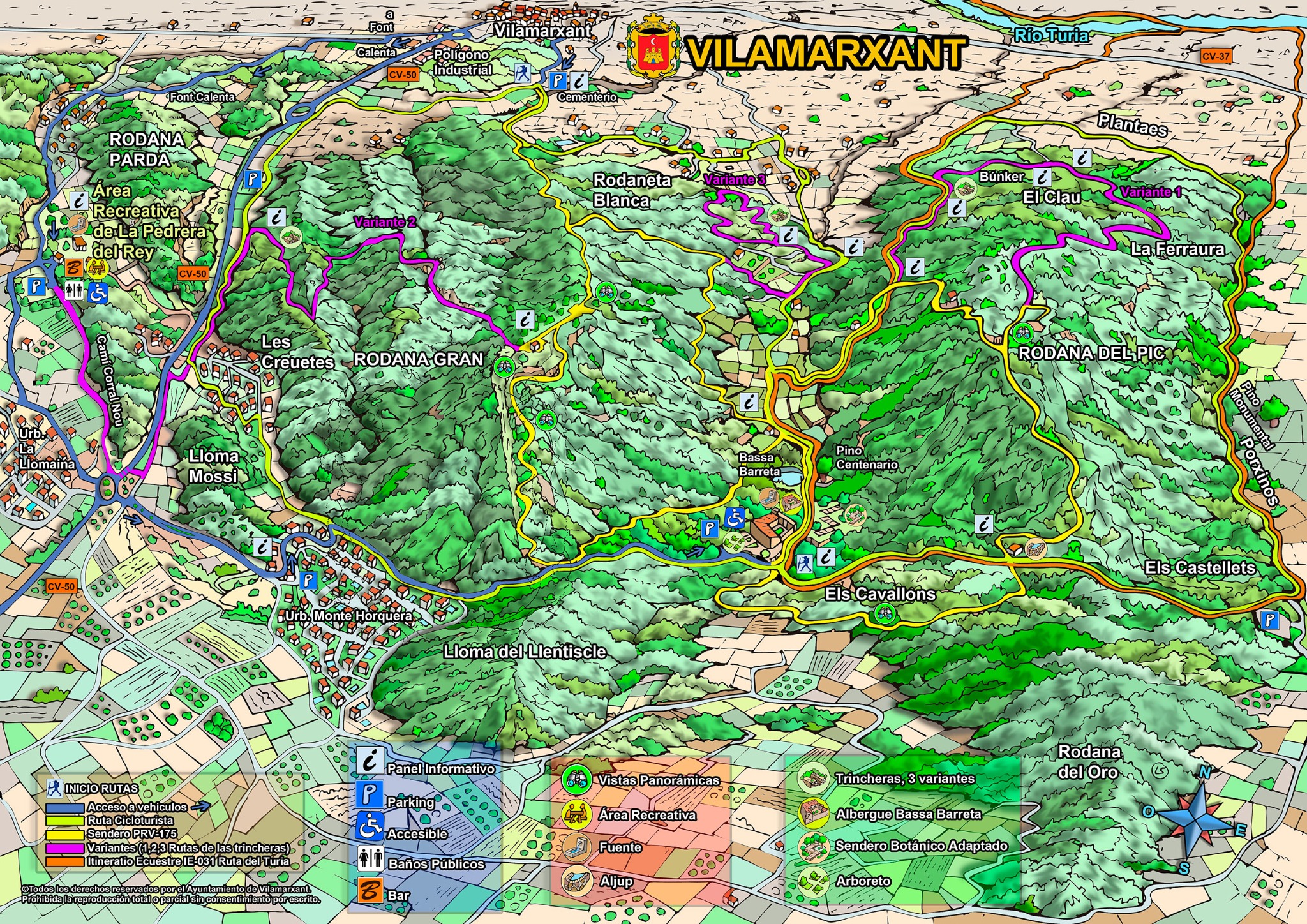 A continuación, se puede observar un plano de «Les Rodanes». En amarillo tenemos el sendero PRV-175, en morado las variantes 1,2 y 3. Donde se puede realizar la «Ruta de las Trincheras». En naranja el «Itinerario Ecuestre IE-031 Ruta del Turia» y en verde la «Ruta Cicloturista»